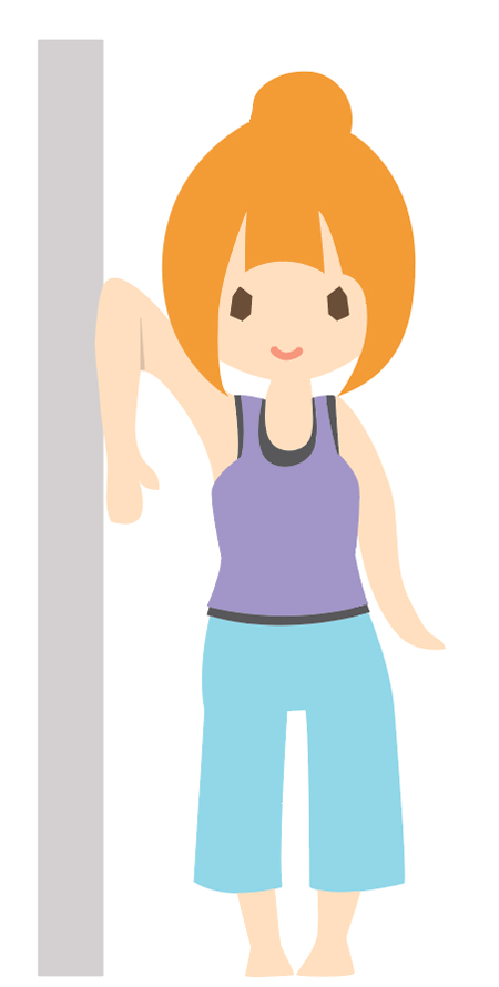 1)肘を耳の横に挙げた状態で横の壁に寄りかかり、脇の下の筋肉を30秒程伸ばす。