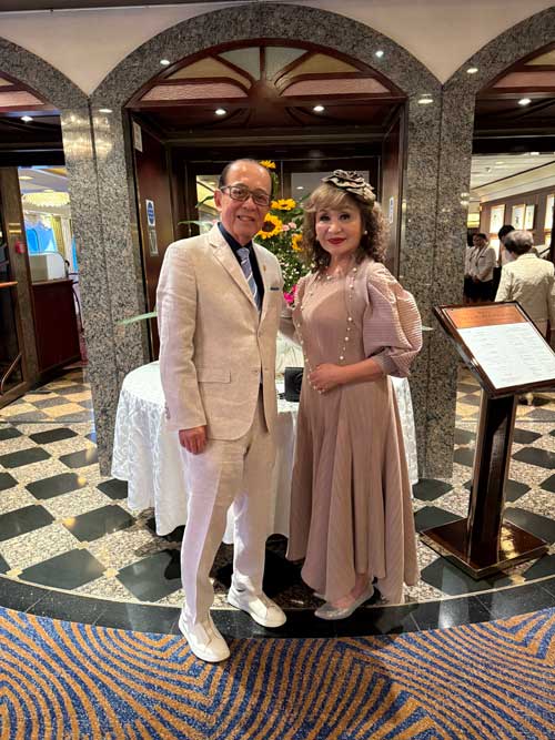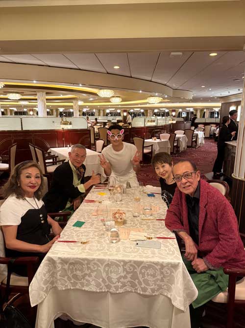 横浜出港までは、あまりに雑事が多くて、本当にこの「あすか」に乗れるのかしらと、心配になったほどでした。乗船手続きを済ませて皆さんに迎えられたとき、思わず泣きそうになってしまいました。2回ほど、自分でダメだダメだ。こんなところで泣き出したら大変だからとぐっと涙をこらえました。今夜は初めてのフォーマルディナーです。