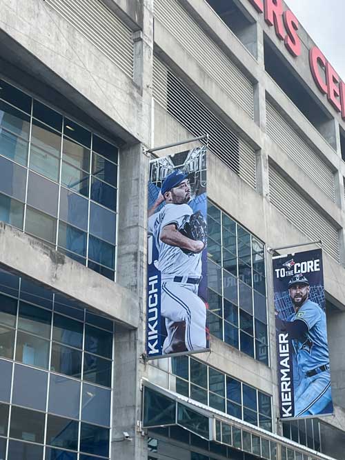 4月のとある火曜日。午後7時からの試合を見にユニオン駅近くにあるロジャーススタジアムまで足を運びました。地下鉄で移動中からすでにユニフォームを着たファンらしき人たちを見かけ、スタジアムに着く頃にはファンの群れであふれていました。CNタワーのすぐ下にあるスタジアムに行くこと自体初めてでしたが、スタジアムの旗の中には日本出身でブルージェイズに所属する菊池雄星投手の旗も。ついにやってきたんだというワクワク感を抑えられないほど、大興奮でスタジアムに入りました。