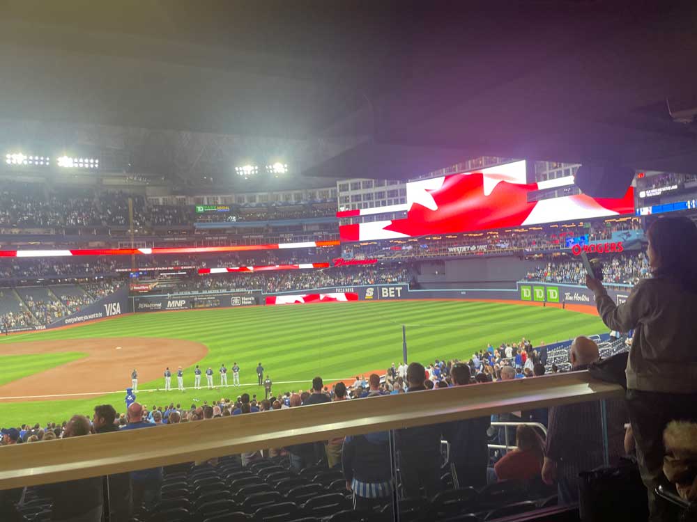 試合開始ギリギリにスタジアムに到着したので、すでにアメリカとカナダのそれぞれの国歌斉唱が始まっていました。今日の対戦相手は、あのイチロー選手も所属していたシアトル・マリナーズ。正直、マリナーズにもブルージェイズにも知っている選手はほぼいませんが、今日は人生初のメジャー観戦ということで、レベルの違う野球を見ることを単に楽しもうと思っていました。