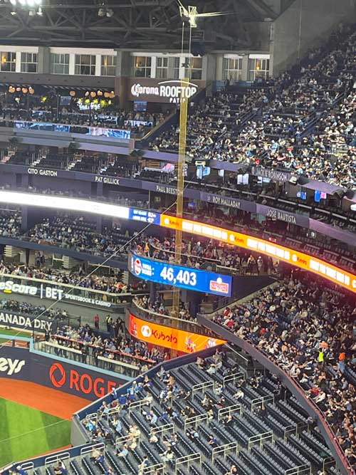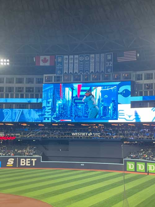 国歌斉唱が終わると選手紹介のビデオが流れ、いよいよゲーム開始といった大盛り上がりの雰囲気を感じます。やはりローカルのチームということもあり、ほぼ満員のスタジアムにはブルージェイズのユニフォームを着たり帽子をかぶったりした大勢のファンであふれかえっていました。日本の野球だと、応援団もいて応援歌を常に歌っているような雰囲気の中で試合が始まりますが、やはりここはカナダ。応援団はおらず、ビールを片手に話をしたりヤジを飛ばしたりしながらそれぞれが自由に野球を見るのが普通のようです。少し寂しいような気もしましたが、チャンスの場面では拍手を促したり、声を出すよう指示があったり、意外にも会場全体を一体化させようとする工夫がされていて、みんなで声を出して応援する瞬間はやはり楽しいものだなと感じました。