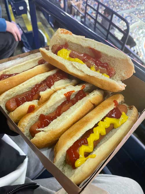 野球を見ながら何か食べたい…というときに、毎週火曜日だけの特別サービスがあります。実はこれを目当てに火曜日に野球観戦しに行ったという事情もあったのですが、「ルーニーホットドッグ」というわずか1ドルのホットドッグを何本でも買うことができるのです。とりあえずと、私と友人は6本購入しましたが、周りのファンたちは買って食べてはまた買いに行って、を繰り返して10本以上買っているのではないかという人もいたほどです。スタジアム内の電光掲示板にどれだけ売り上げたか数字が表示されるのですが、帰る頃には6万本近かったと思います。