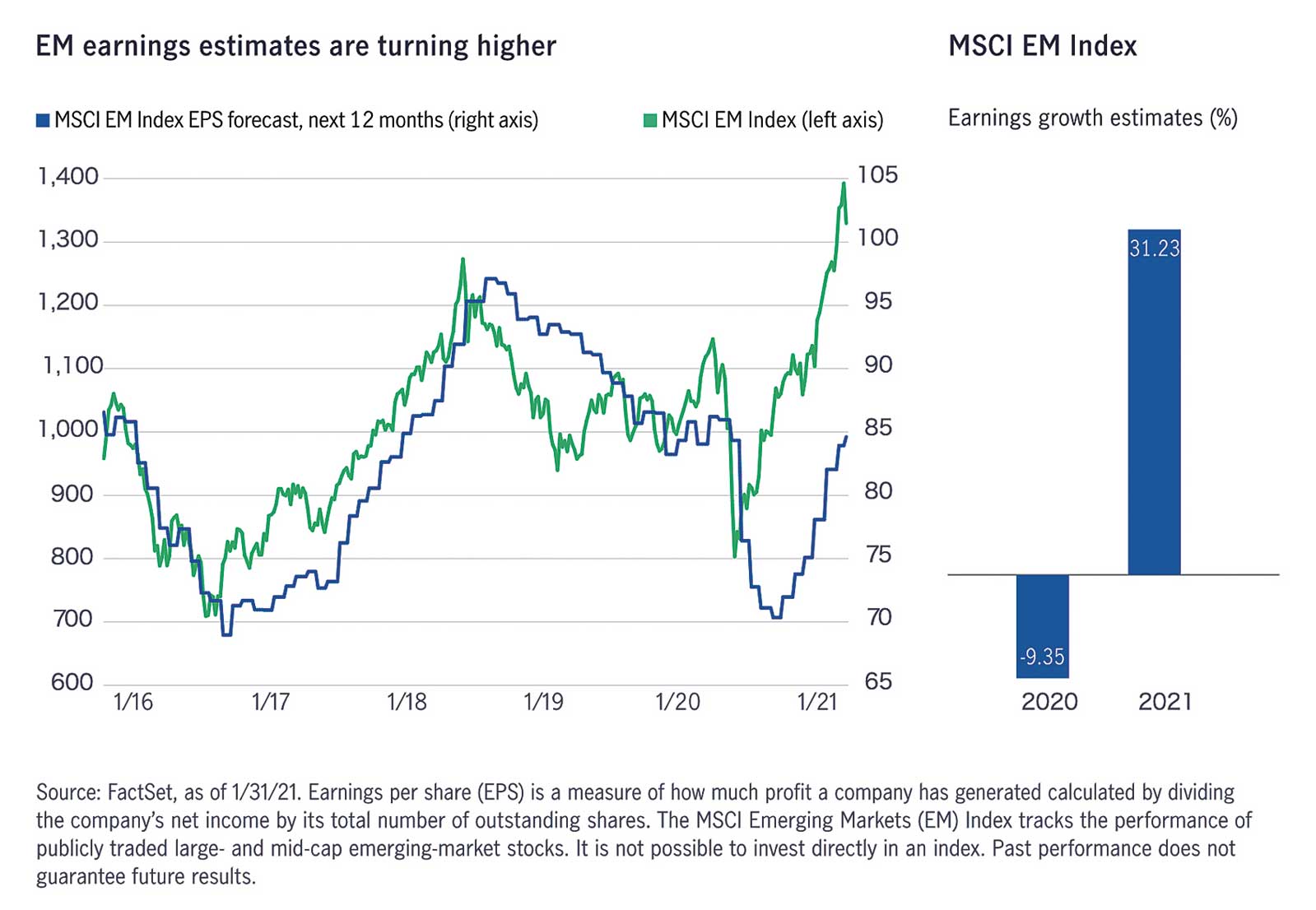 2021年の新興市場の経済成長率のコンセンサス予測は最近アップグレードされ、7.5%を上回り、新興市場収益成長率は前年比で30%以上と予測され、そして、その強さは続くかもしれません。さらに、金融政策と財政政策は依然として明らかで、北米、ヨーロッパ、および日本では、新興市場の経済成長を引き続き支援します。