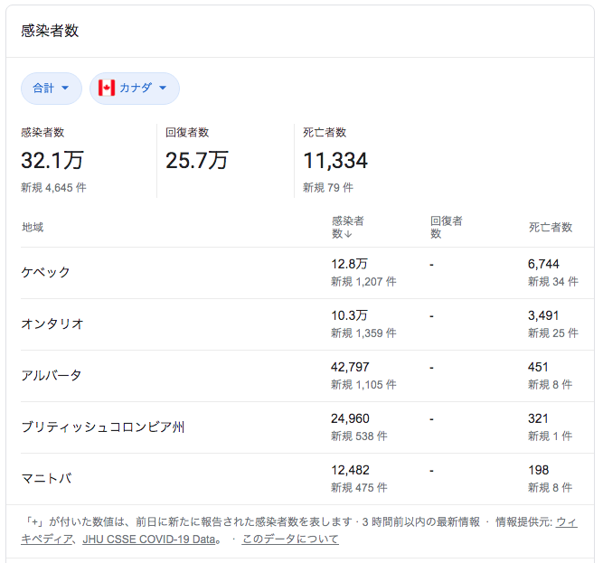 カナダのこれまでの感染者数は32万1000人、死者数は1万1334人となっている。