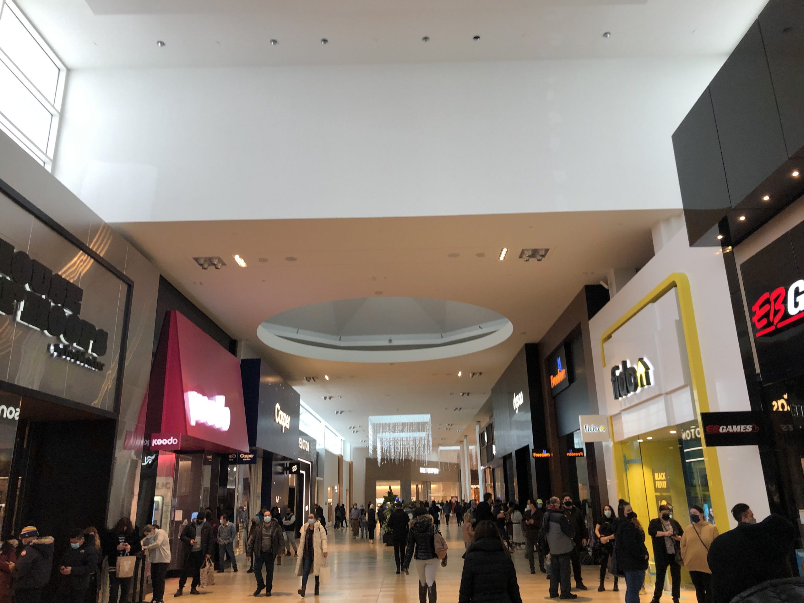 今日からショッピングモールなど小売店の店内営業が閉鎖されることもあり、ロックダウン前日となる昨日日曜日は、各地の大型ショッピングモールやカナディアンタイヤなどの大型店に買い物客が押し寄せ大混雑となった。上記写真はカナダ最大の売り上げを誇るトロント北西部にある「ヨークデールショッピングモール」の開店前の状況。各店11時のオープン予定だが、すでにモール内は混雑しており、またクリスマスショッピングを求めてカナダグースやルルレモンなどには長蛇の列ができていた。午後には道路も大渋滞となっており、これよりひどい状況だったことがうかがえる。