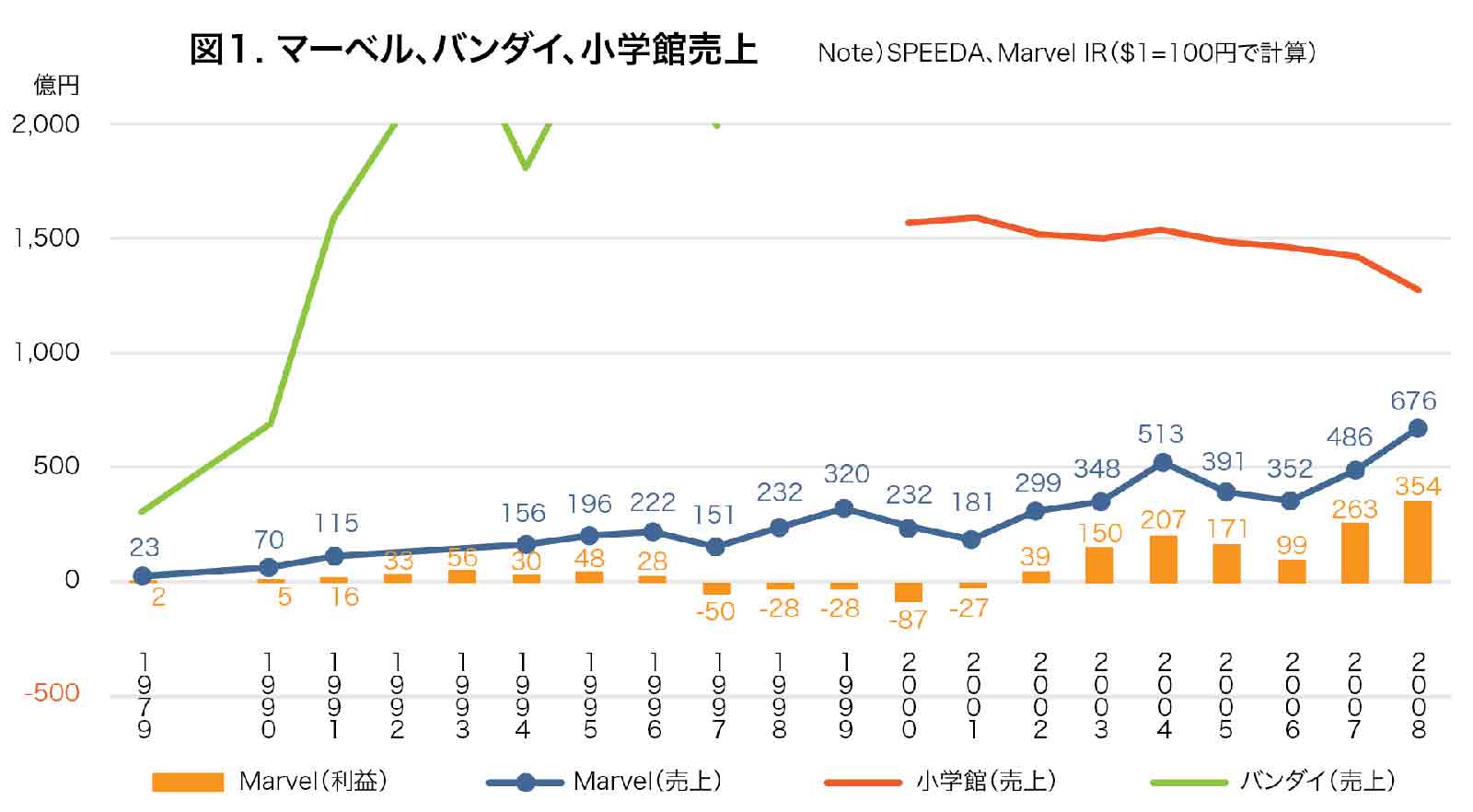 図1でマーベルの売上をみてみると、80年代まではあくまで100億円未満の一出版社でしかありませんでした。その成長はバンダイや小学館、ディズニー、マテルなどほか日米のエンタメ・玩具・映像企業からみるとずいぶんと緩やかです。結果、1ビリオンドルを目指す総合エンタメ企業となるペレルマンの挑戦に構造的な体力がついていかず、倒産。マーベルのキャラクターカタログの本当の価値がみえてくるのは2003年のソニーピクチャーズによる「スパイダーマン」以降の話、ということになるのでしょう。