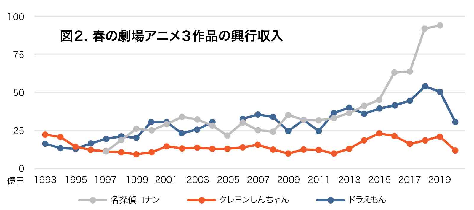 子供向け春劇場映画の3作品、「ドラえもん」「クレヨンしんちゃん」「名探偵コナン」は明確に2015年以降に興行収入を増やします。これはいわゆるジブリロスで、家族で視聴する何かを求めてこの3作品に転化していった結果だと思っています。