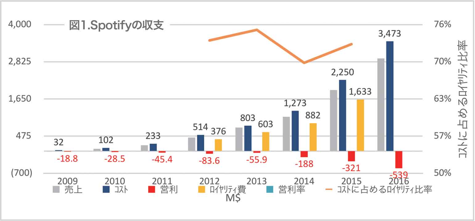 音楽という権利ビジネスにおいて、既存の楽曲の権利所有者を抱き込まない限り、こうしたユーザーの利便性のみを追求したTech勢が合法的に産業からはじき出されるのは、自明の理でもあります。少し昔にツタヤがレンタルビデオ・CDをはじめたときも同じ問題がおき、その際はCCCが27億円を支払うことで合意までもっていきました。Spotifyも株式を世界トップ3のソニーミュージック、ユニバーサル、ワーナーと資本関係を結ぶことにより、権利者利益に沿う形で成長したのです。そうするとどうなるか。図1は世界最大の音楽定額配信プラットフォーム、Spotifyの業績です。売上は3000億近くまで伸びている反面、赤字はずっと広がっています。というか創業以来黒字が出たことがありません。なぜか。売上の7-8割がすべてロイヤリティで支払われているのです。ものすごく聴かれるようになった楽曲は世界で1億人規模で支えても、重過ぎるロイヤリティでその存在が押しつぶされてしまったりもします。
