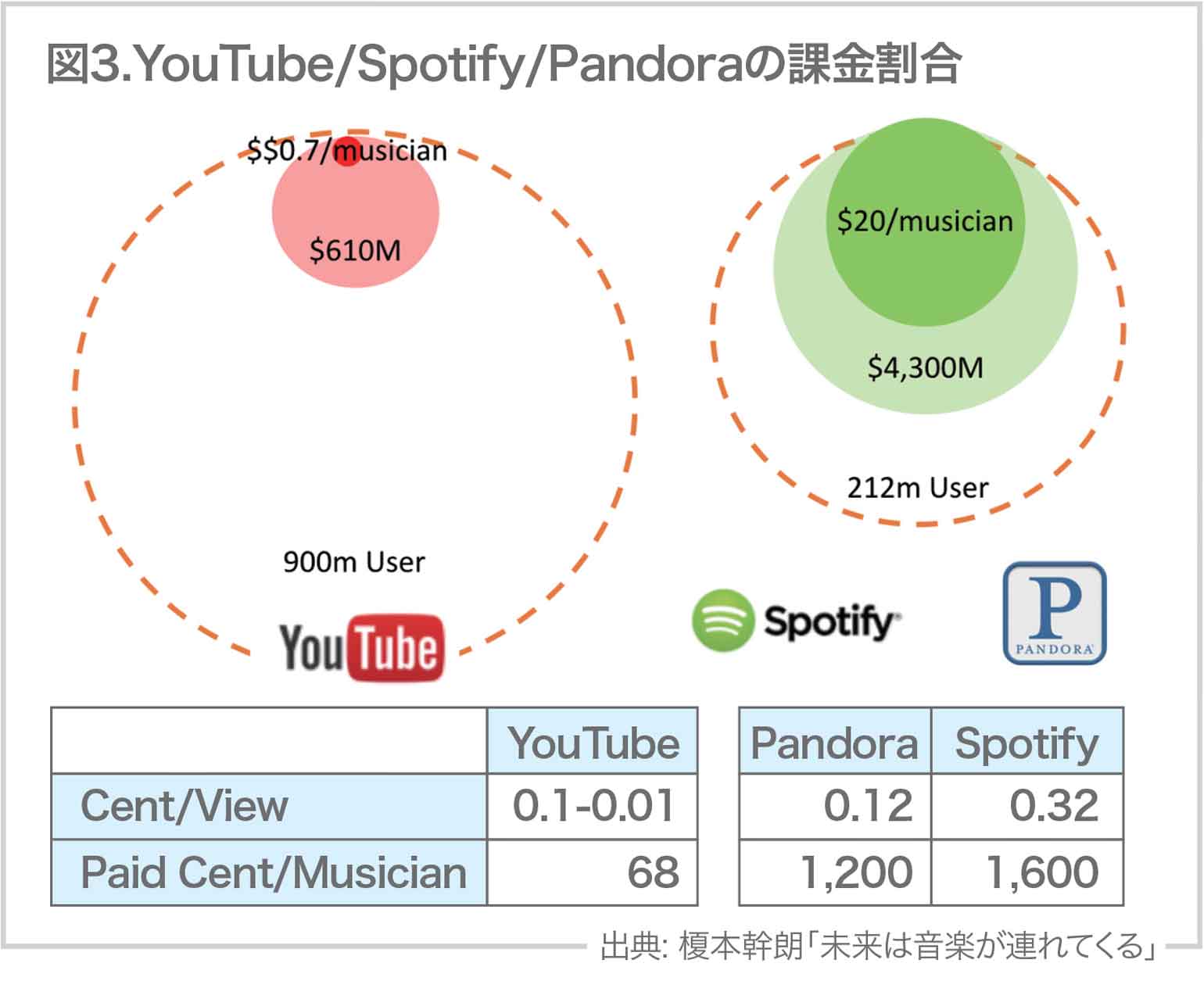 じゃあそんなに著作権払わなければいいんじゃない、ということで第3ポジションにYouTubeがいます。YouTube視聴の6割が音楽ビデオです。大半が音楽をきくためにYouTubeを使っています。そのYouTubeからお金がとれない、ということが楽曲権者のなかで問題になっています。図3はYouTubeとSpotify/Pandoraの違いについて表しています。YouTubeでは9億人ユーザーがいますが、1回視聴してもらっても広告価値としては0.1円、合計すると広告市場規模は610億円。うちミュージシャン自身には1人あたり70円くらいしか還元されていません。対するSpotifyやPandoraなどサブスクリプションは2億人ユーザーがおり、そこからの収益は世界で4300億円。こちらは1回視聴ごとに12-32円程度の還元を行っています。だからテイラー・スウィフト全員からお金をとっているため、視聴あたりの価値が高いのです。それは同時に、ミュージシャンへの還元率も高いのです。1人あたり1200~1600円。なんとYouTubeの20倍前後もの支払いをしています。これがゆえに「YouTubeは音楽家の敵」といった訴えがテイラー・スウィフトからも出ています。