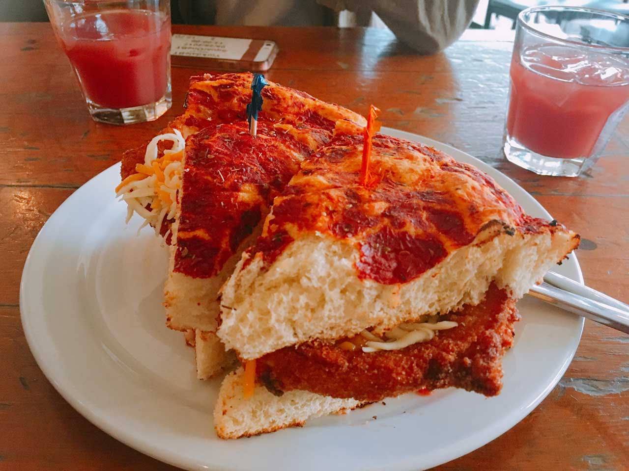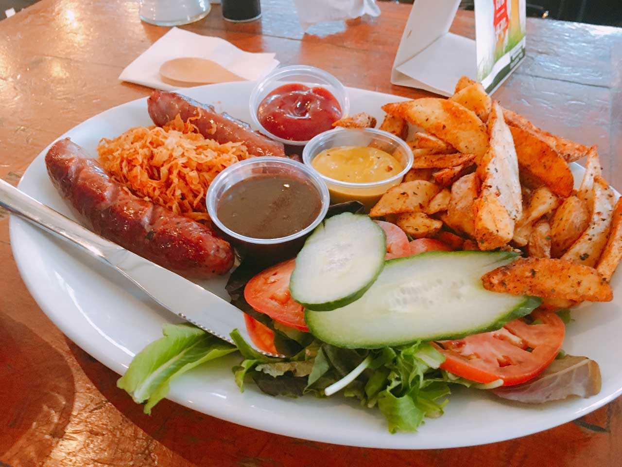 私たちは、チーズたっぷりのチキンのサンドウィッチとソーセージのプレートを頼みました。(思ったより大きくてびっくりしたのは内緒です。笑)
