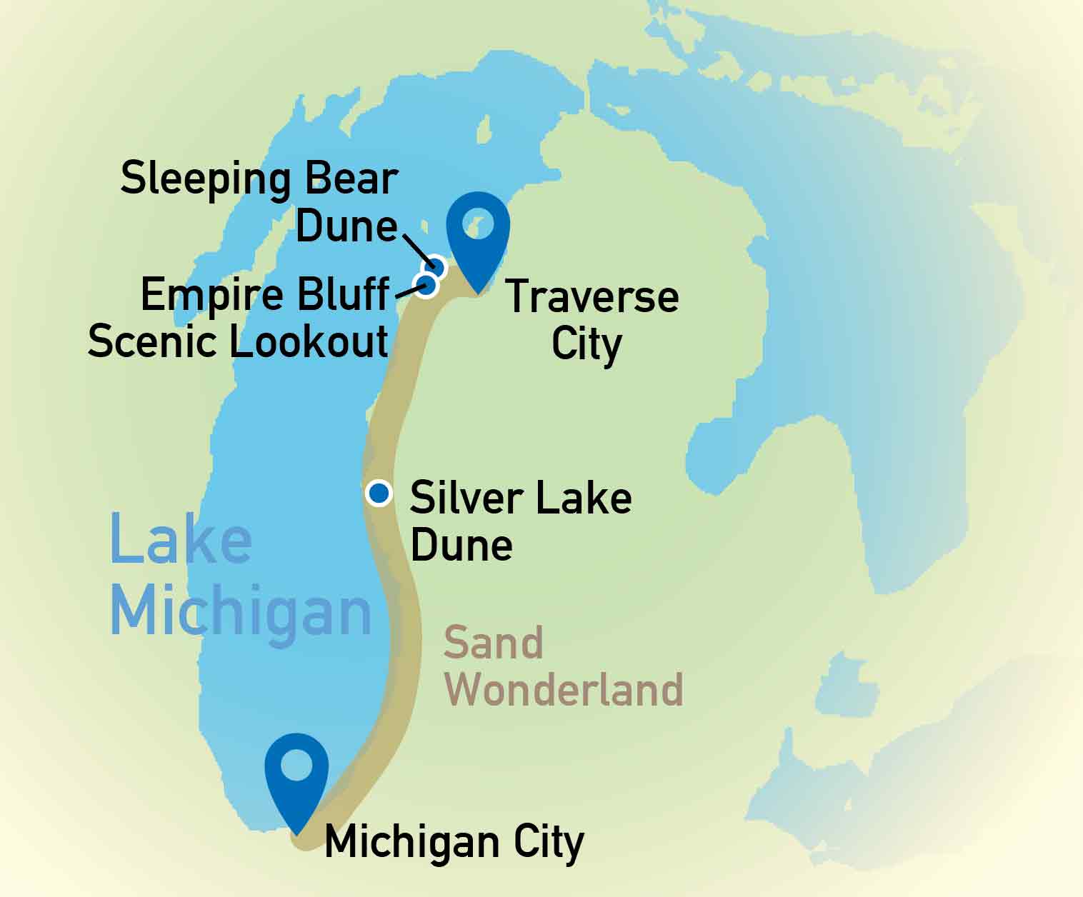 その地域は、ミシガン州の西側をほぼ全て覆いかぶさるように広がりますが、その中でもトラバースシティからインターステイト31号線を南下しインディアナ州のミシガンシティまでの450キロは、大小様々な砂丘が広がる、Sand Wonderlandとしてアメリカだけでなくカナダ、オーストラリアなどさまざまなな場所から、多くの観光客が訪れる人気のスポットです。