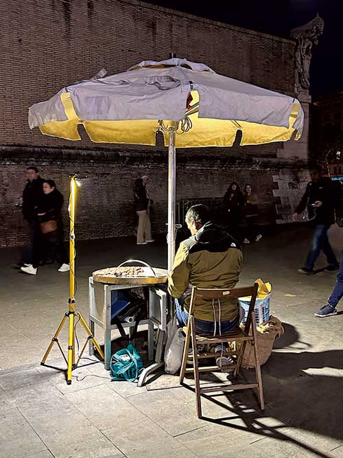 屋台の後ろにはヴァンが何台も止まっていてアジア系の売主たちが品物を物色するお客の動向を見ている。インド、スリランカ、バングラデッシュから移民で来ている彼らは品物をミラノで仕入れてローマでさばいているのだとか。ストリート・ヴェンダーで果物やお土産を売っている者も夜の焼き栗屋さんもアジア人だった。