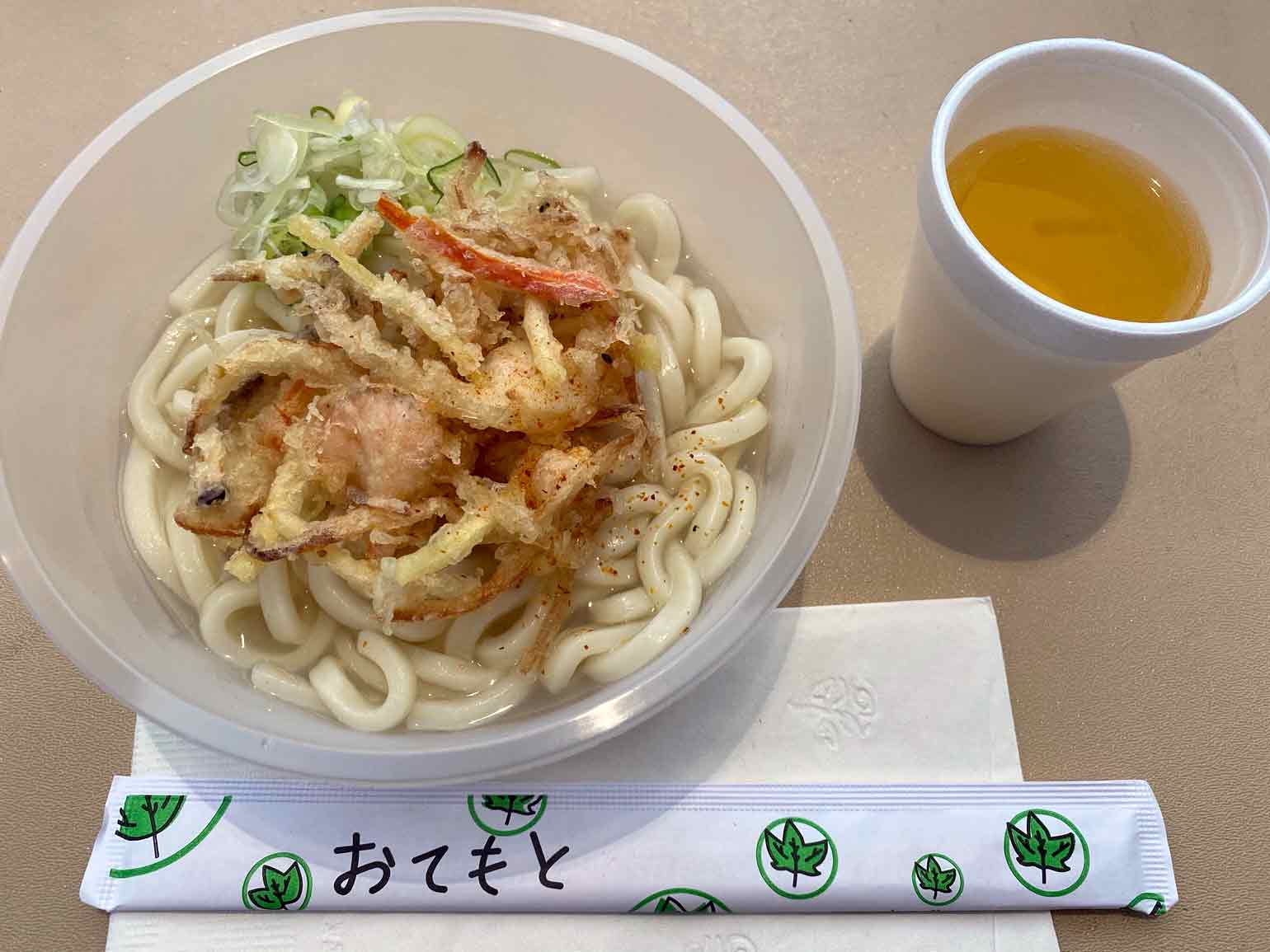わたしたちは、フードコートでかき揚げうどんを食べました。