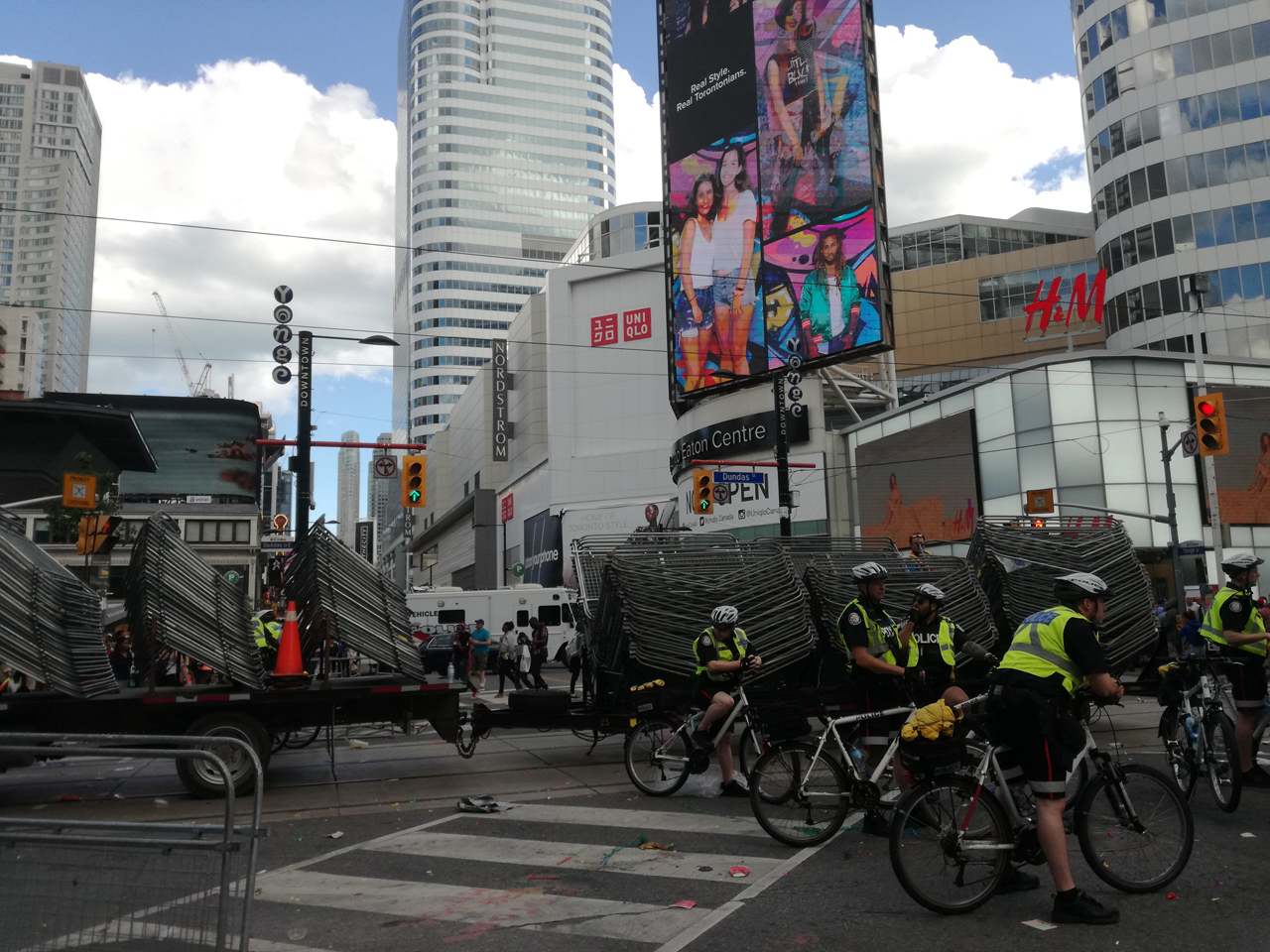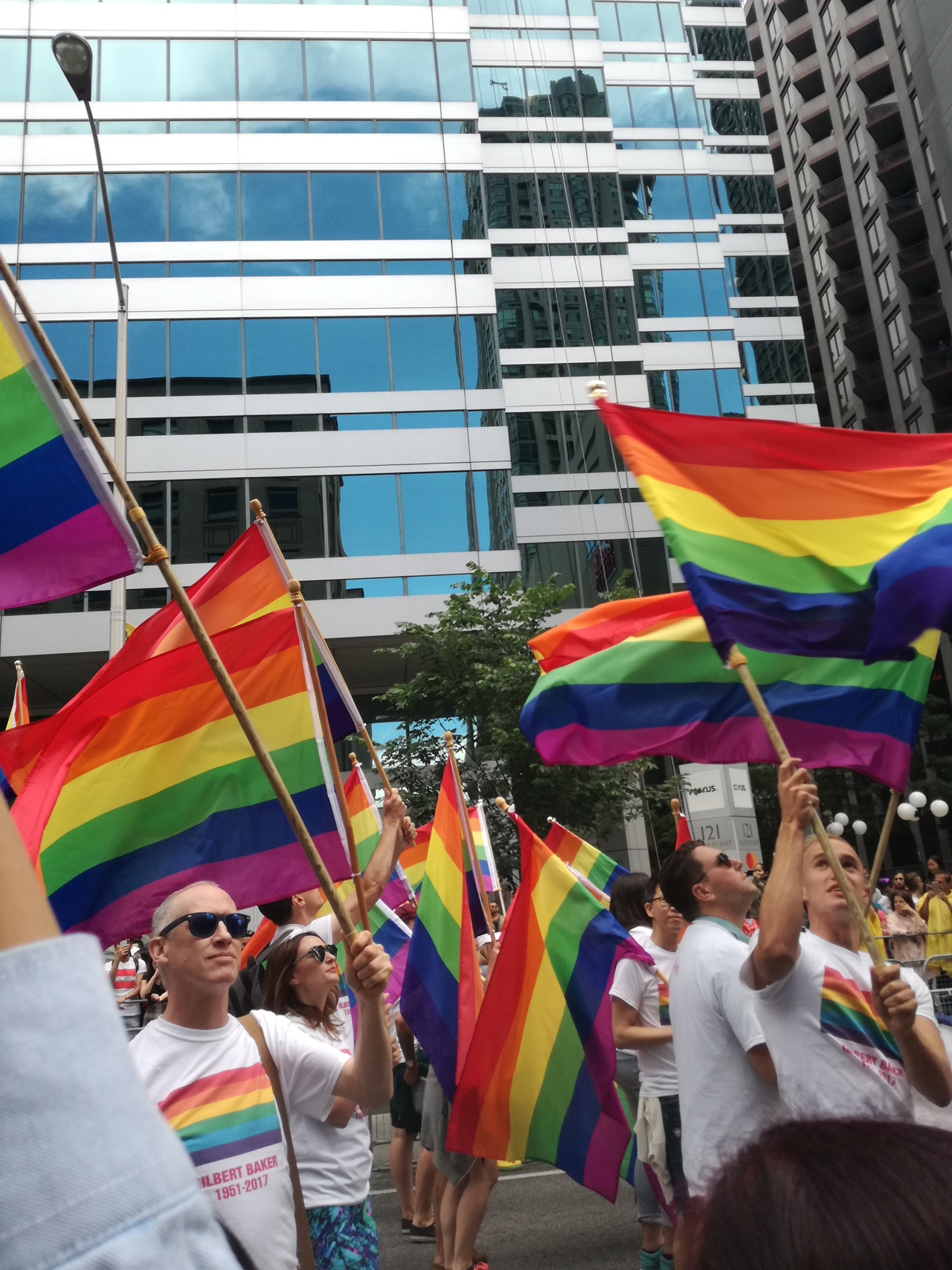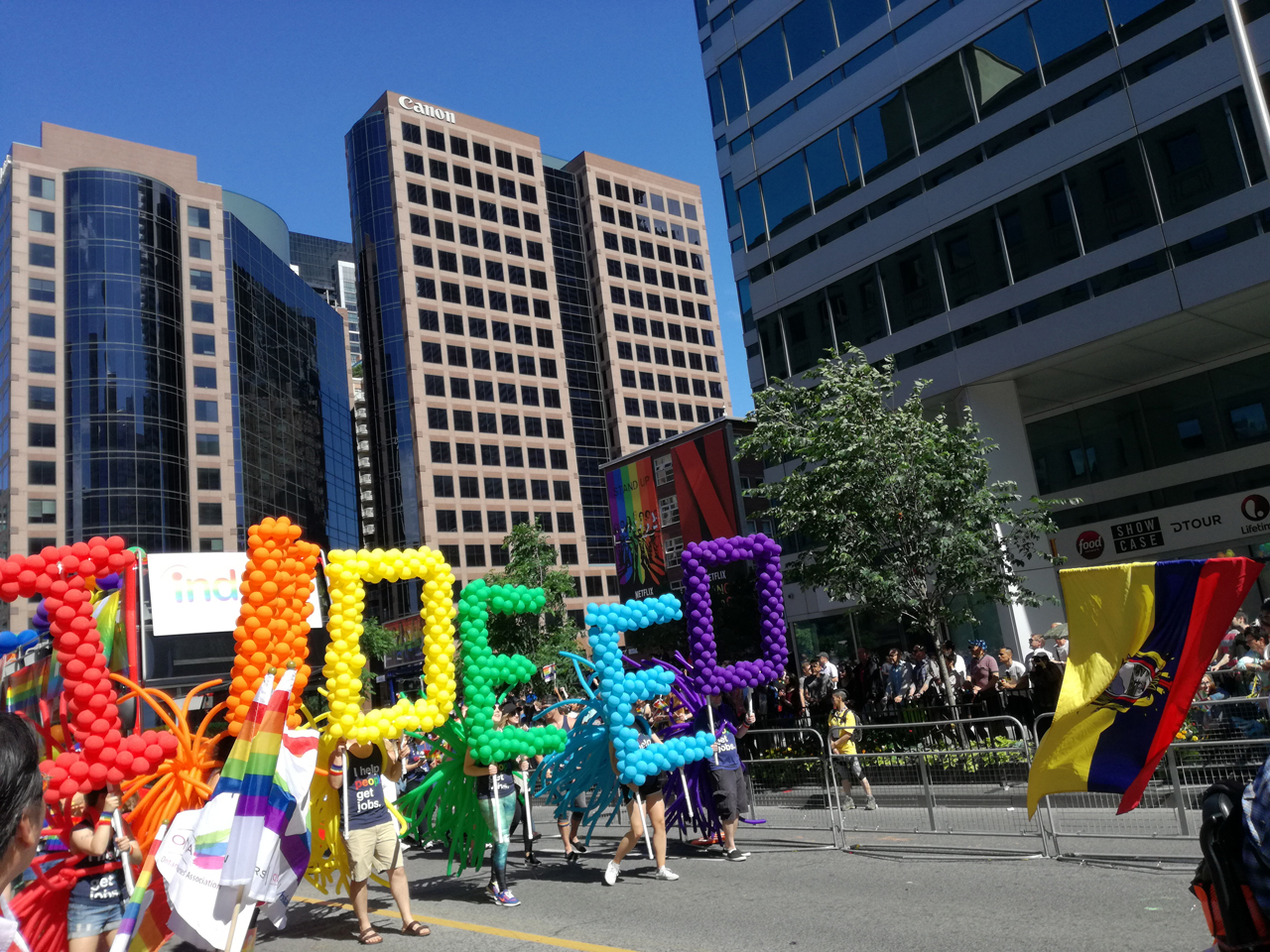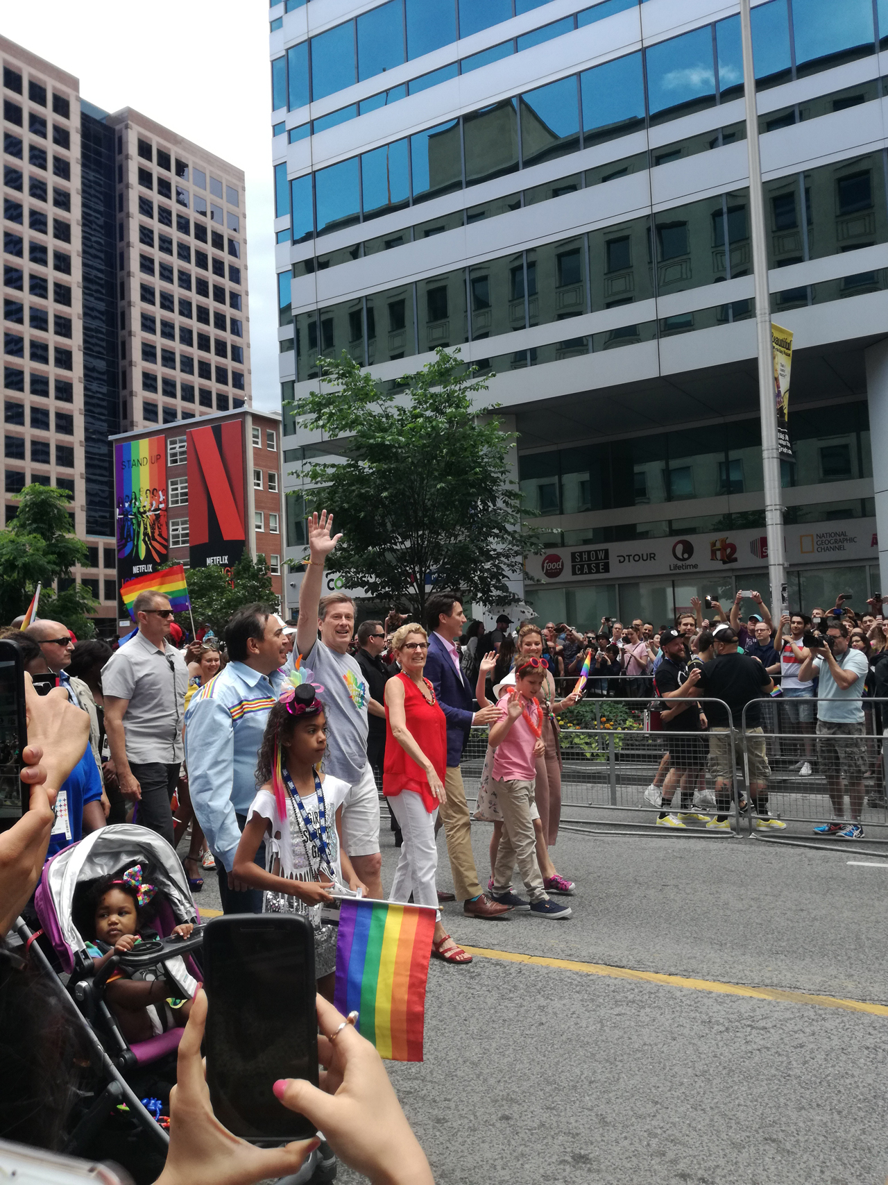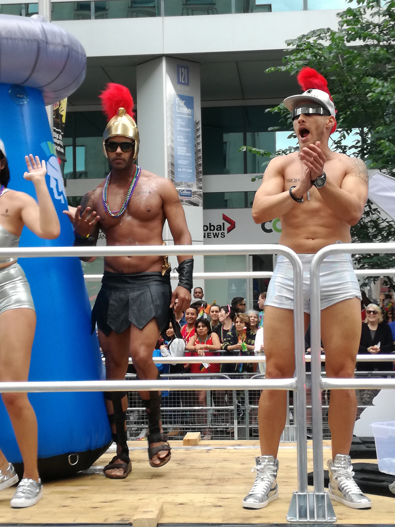 14時に始まったパレードはジャスティン・トルドー首相のお出ましを皮切りに約3時間、歌い、踊り、叫び、水鉄砲で観客に水を浴びせ、マッスルマンもいれば、全裸もいたりと、モチーフカラーのレインボーの如く、千差万別繰り広げられ”So Exciting”でした!