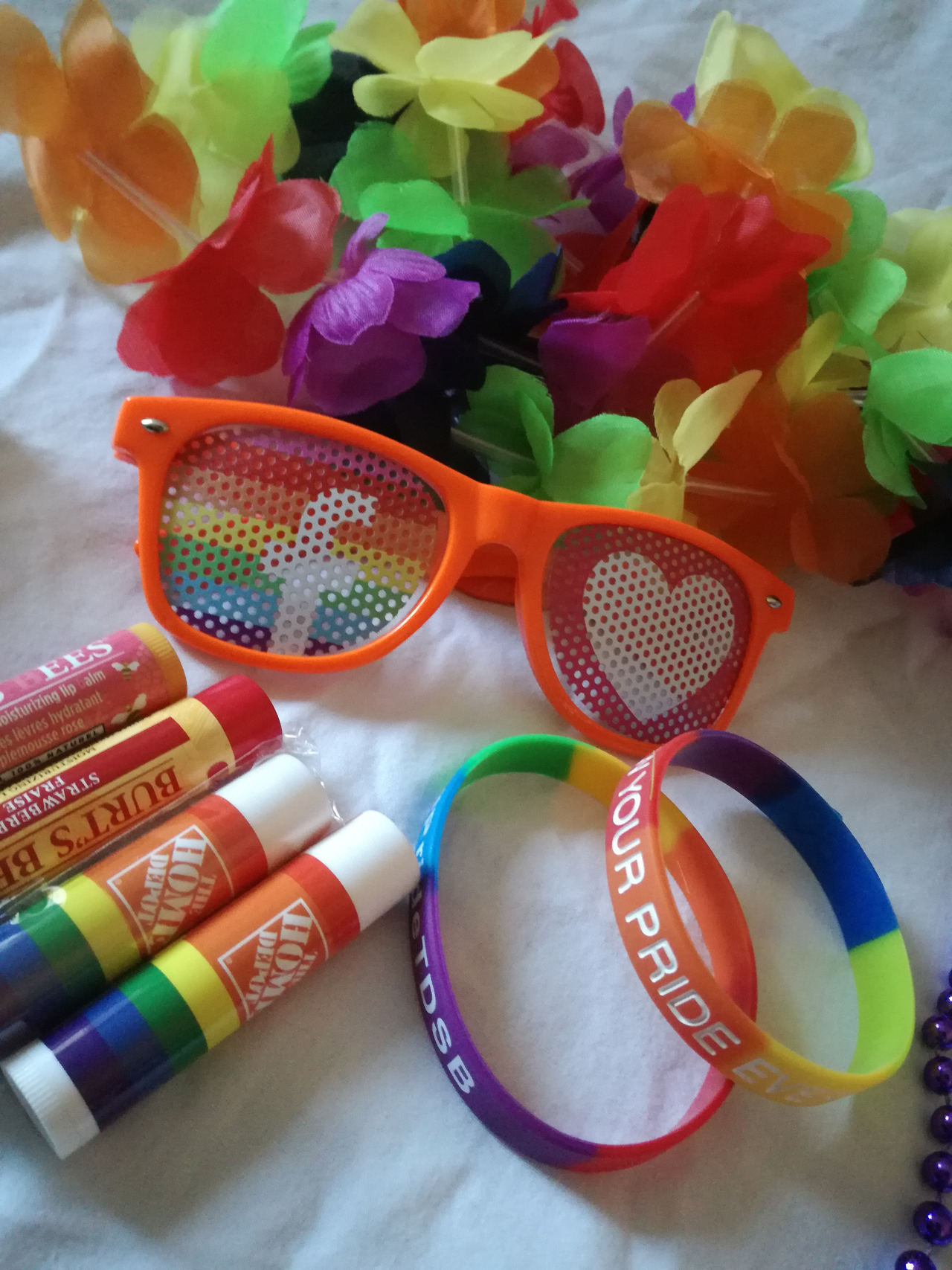 その戦利品がこちら。カラフルネックレス、ハワイアンレース、サングラス、リストバンド、リップスティック、USB、タトゥー、コカ・コーラ、コンドーム(笑)等々盛りだくさん。この他にもまだまだグッズを投げ放っていました。お陰さまでパレード後は立派なパリピに仕上がりました。左端が私、yoshieです。