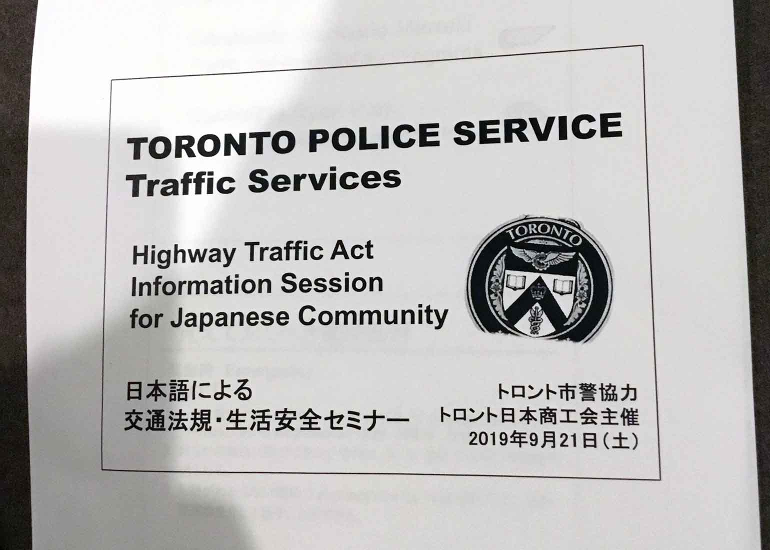 その名も「日本語による交通法規・生活安全セミナー」です。このセミナーはトロント日本商工会主催によるもので、なんとあのトロント市警協力のもと行なわれました。