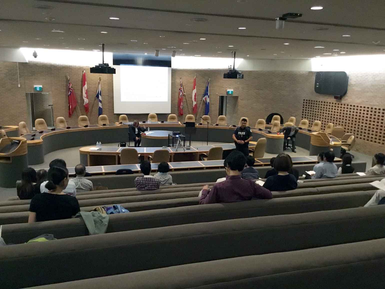 交通法規セミナーの前には、トロント市警の方から普段の身を守るための重要な情報が。非常に重要でありながら、普段は訊くことのできない情報に、参加者は皆興味津々と言った様子でした。