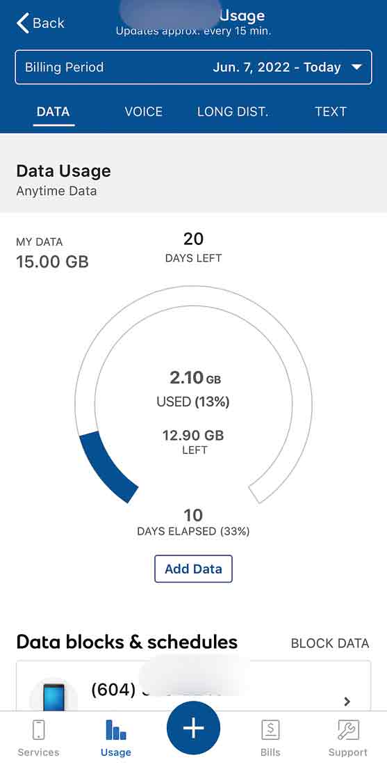 初期設定後に早速ログインすると、USAGEという項目があり現在どのくらいのデータを使っているかリアルタイムで確認できます(約4時間前までのデータ表示)。他にも、ローミングチャージや超過料金がある場合はリアルタイムで確認できます。カナダは基本料金+50ドル以上料金が超過するとアラートが来るので、クリックして請求に同意しない限り50ドル以上の請求がされない様に法律で守られています。おかしいなと感じたら消費者センターへ問合せを。