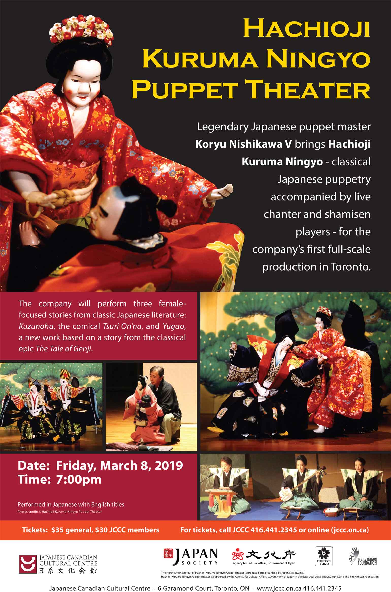 今回のトロント公演では人形遣い6名、大夫1名、三味線2名が揃うフルスケールの公演。日本古典文学から女性が主役の3つの物語を演じる。