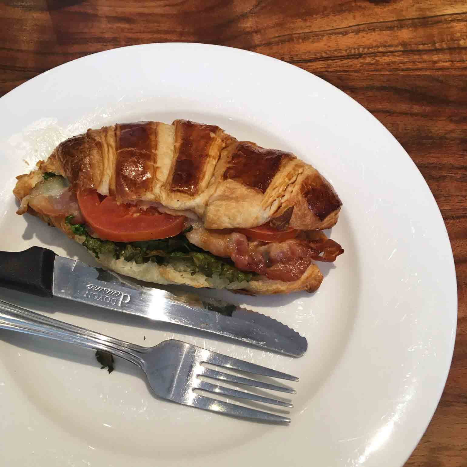 クロワッサンサンドには、ベーコン、レタス、トマトにとろける(ポイント!)チーズがたっぷり。熱々のコーヒーと一緒に食べると最高です…。