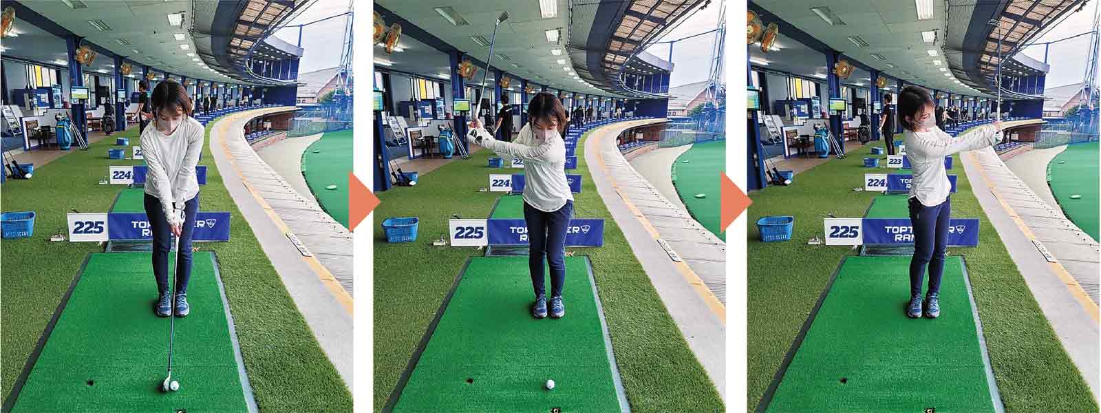 使用クラブは、特に決めません。足を閉じてまっすぐ立ったら、いつも通り前傾し、アドレスを作ります。あとは背骨軸を中心に腕を振るだけです♪簡単♪足を閉じていい球が打てるようになったら、少しずつ足を開いていきます。間隔は一足分から始めましょう。そして最後は、アイアンの場合は足の外側が肩幅になるまで開きます。ドライバーは足の内側が肩幅になるまで開きます。ユーティリティーやフェアウェイウッドはアイアンとドライバーの間の間隔で調整しましょう。