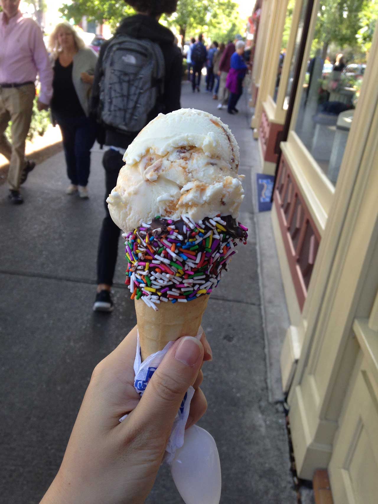 アイスクリームももちろんですが、いかにも手作りといった素朴な味わいのワッフルコーンがクセになります。コーンは4種類くらいある中から選べ、私はカラースプレー付きのものをチョイスしました。これひとつで大満足です。