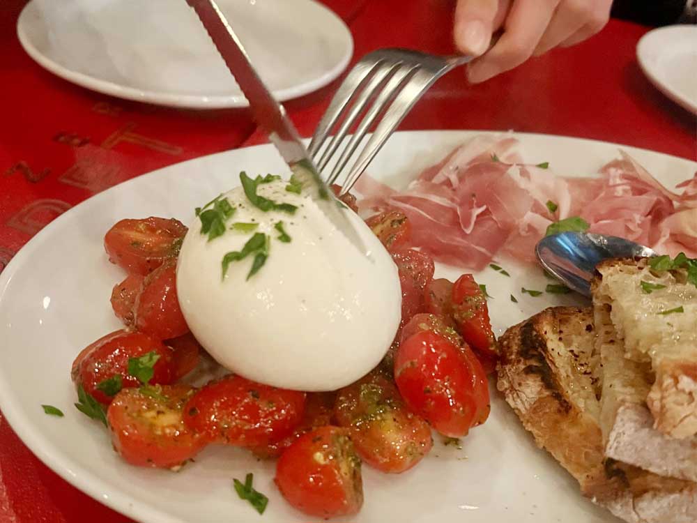 友人たっての希望で頼んだBURRATA ($22)のブッラータチーズがプルプルで、濃厚なのに後味はさっぱりとしていて大変おいしかったです。生ハム、トマト、パンも一緒に乗っていました。