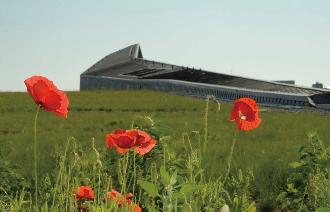 博物館の周りには原っぱが広がり、夏には戦没者追悼のシンボルのポピーの花が咲く。ビルの上には小さな窓がモールス符号の並びで「Lest we forget (忘れないように)」と示している。館内には壁や床、天井に斜めの線が強調されている。それは戦争による不安定さやカオスを連想させるためにある。
