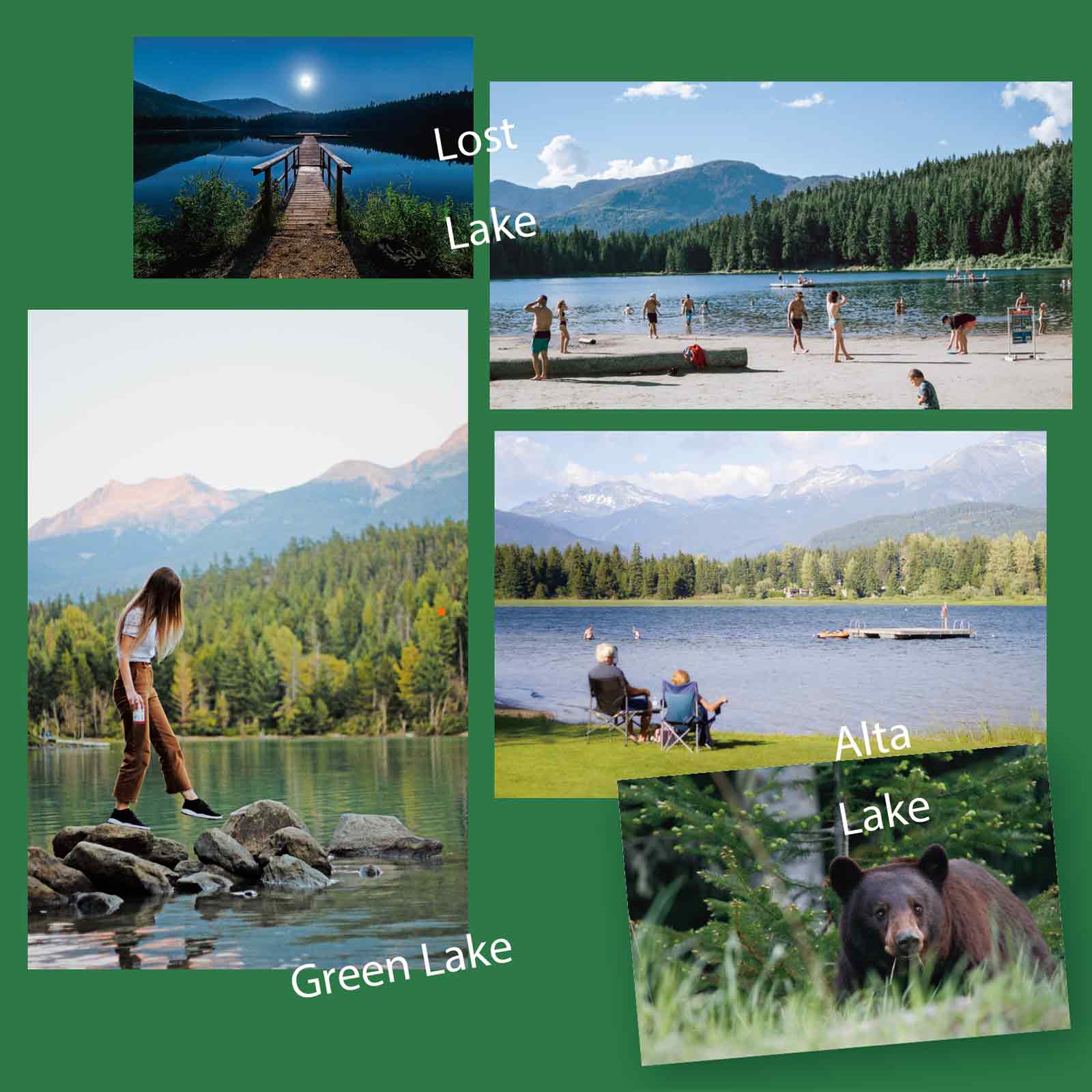 ウィスラービレッジの他にも、街周辺には湖に隣接する公園や砂浜のビーチがあり、人々の憩いの場として親しまれています。