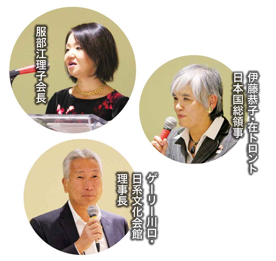 レセプションでは、服部江理子会長がこれまでの歩みや現在の活動内容を紹介する挨拶を述べた後、伊藤総領事とゲーリー川口・日系文化会館理事長が祝辞を贈った。