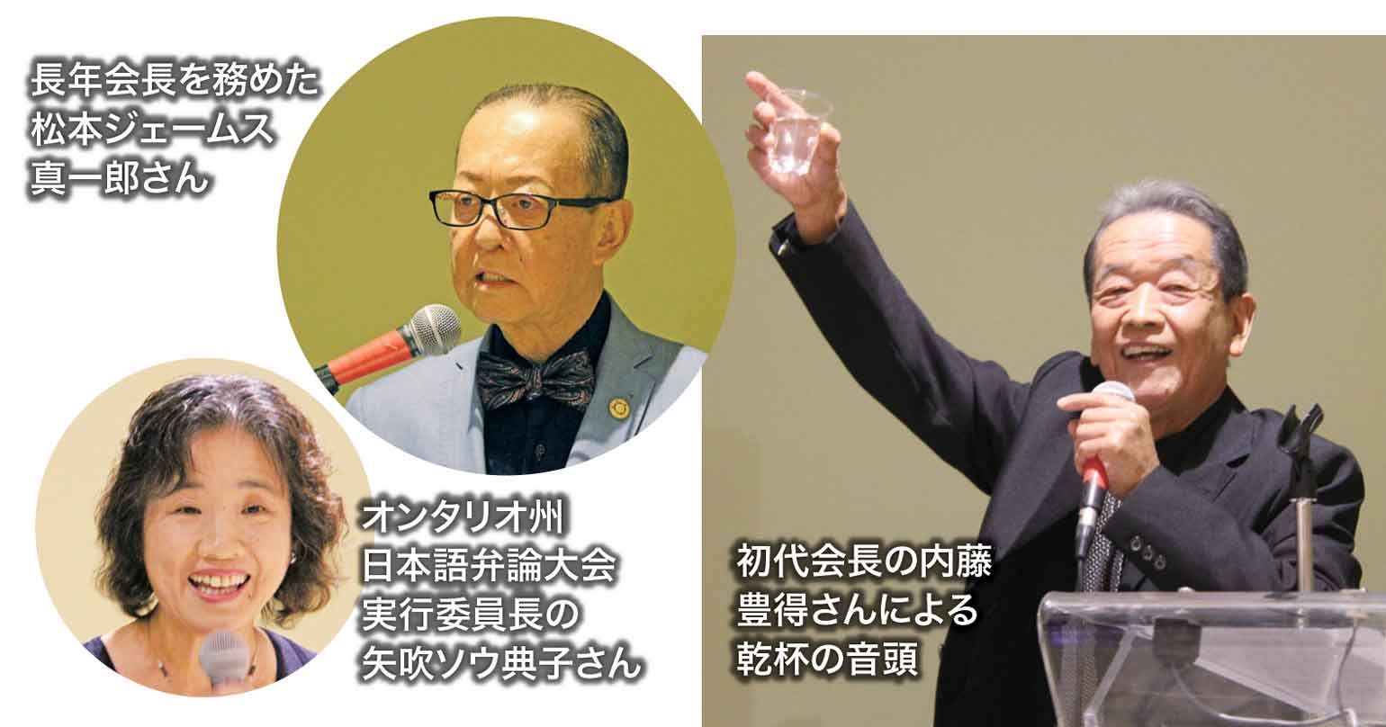 そして、初代会長の内藤豊得さんが発足当時の思い出話を語るとともに、長年会長を務めた松本ジェームス真一郎さんが新企会の意義やさらなる飛躍に向けて期待を込めたメッセージを述べた。また、オンタリオ州日本語弁論大会実行委員長の矢吹ソウ典子さんから新企会とともに企画した相模原賞が紹介されるとともに、受賞者の喜びの声などが語られた。