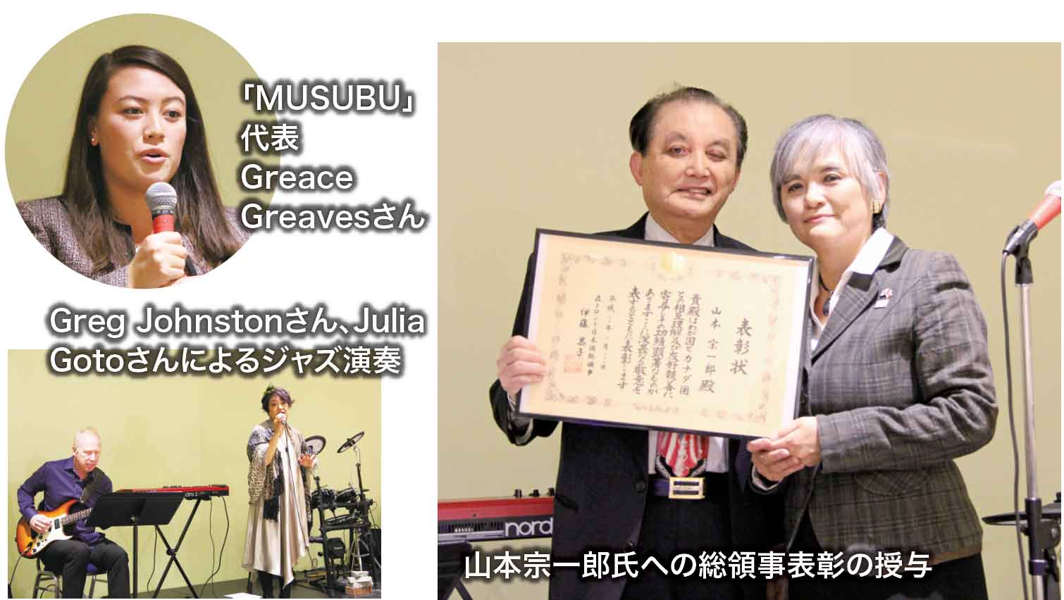 当日は、伊藤総領事から元新企会会長で、ユニラム・コーポレーション社長である山本宗一郎氏に対し、日系コミュニティおよび日系カナダ人社会への貢献と日本とカナダ経済交流などに尽力した功績を称え、総領事表彰が授与された。