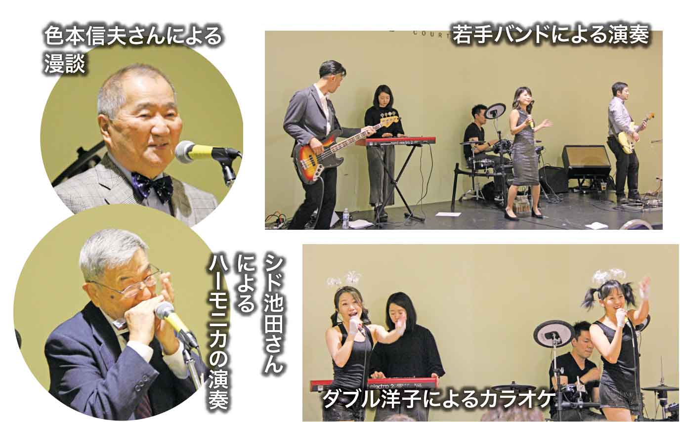 レセプション後半は、様々なエンターテイメントが催され、会場の盛り上がりはピークとなった。昨年結成されたヤングプロフェッショナルの会「MUSUBU」を代表してGreace Greavesさんのスピーチや、Greg Johnstonのギター演奏によるJulia Gotoさんによるジャズ演奏、そして若手グループによるバンド演奏や伊藤総領事とダブル洋子によるカラオケもお披露目された。会の終盤は色本信夫さんによる漫談で会場は笑いに包まれ、締めはシド池田さんによるハーモニカの演奏に合わせて合唱の中、和やかにレセプションは幕を閉じた。