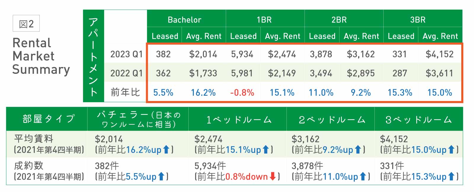 平均賃料を見ますと、バチェラー(ワンルームタイプ)、1BR、2BR、3BRのいずれの部屋タイプも平均賃料は前年に比べて10~15%前後上がっています。成約件数は1BRタイプのみ前年に比べると若干減っていますが、他のタイプのお部屋も含めて、住宅ローンの金利を受けていなかった2022年第1四半期に比べて、賃料相場が大幅にアップし、借手にとっては厳しい賃貸状況となったことを示しています(図2)。