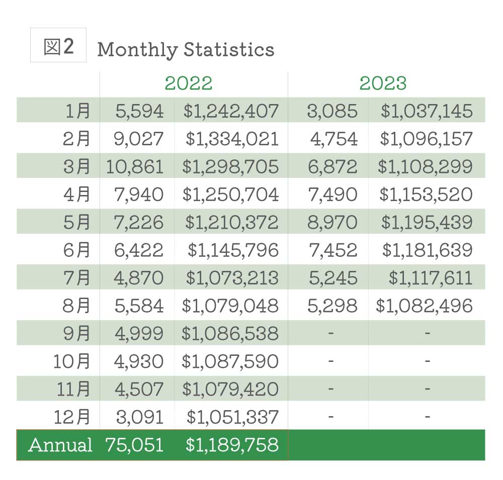 2023年1月以降、不動産平均価格は少しずつ上昇し、4月~7月の4か月間は110万ドルをキープしています。8月は110万ドルには満たなかったものの、2022年の年間平均不動産価格の118.9万ドルに対して、2023年1月~8月の8か月間の平均不動産価格は112.1万となっていますので、今後9月以降の不動産価格が昨年と比べてどうなるのか気になるところです(図2)。