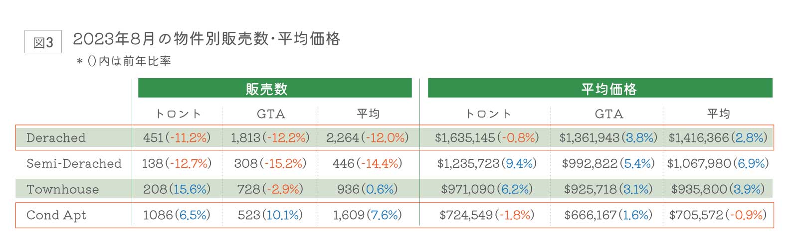 8月のマーケットデータによれば、戸建(Detached)の成約件数は2264件と前年同月比に比べて12%DOWNとなりましたが、平均不動産価格は141万6366ドルと前年同月比2.8%UPという結果になりました。コンドミニアム(Condo Apt)の成約件数は1609件と前年同月比に比べて7.6%UPとなりましたが、平均不動産価格は70万5572ドルと前年同月比0.9%DOWNと戸建に比べて真逆の結果になっているのが興味深い点です(図3)。