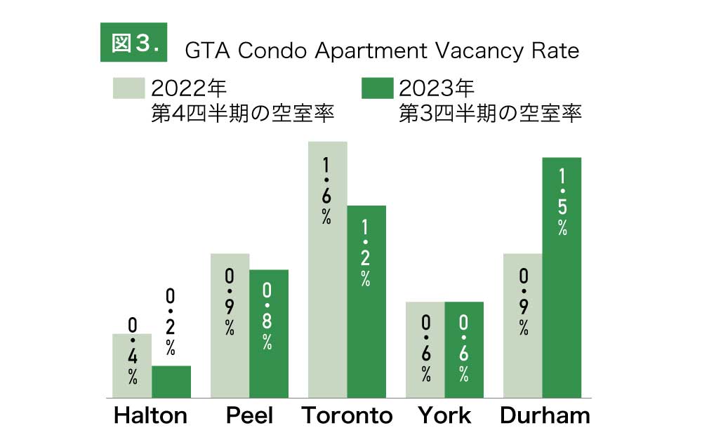 2022年末には1.6%だったトロントの空室率が2023年第3四半期には1.2%と大幅にダウンしました。Peel地区は0.8%から0.9%に、Halton地区は0.2%から0.5%とアップしました。一方York地区は0.6%として変わらず、Durham地区は0.9%から1.5%と大幅にアップ、Halton地区は0.4%から0.2%にダウンという結果でした(図3参照)。