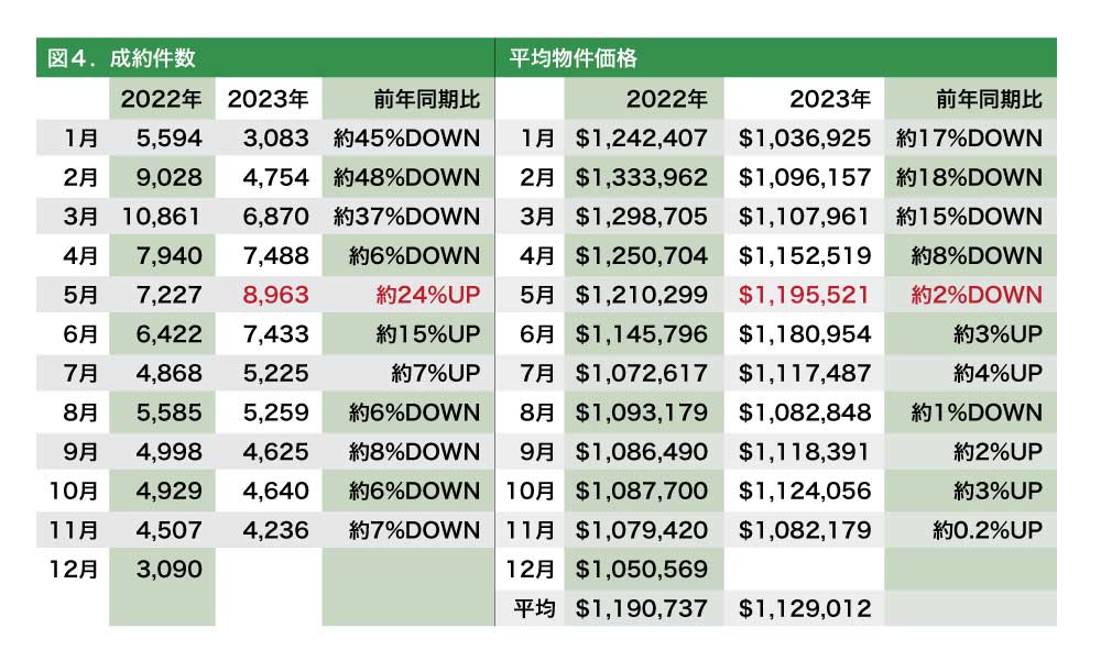 2022年以来の住宅ローンの高金利の影響を受け、2022年7月から2023年2月までの平均不動産価格は100万ドル台が続いていました。2023年3月以降は8月と11月を除いて110万ドルを記録し、最高値は5月の119.5万ドルでしたが全同期比2%ダウンの結果となりました。これは2023年も2022年後半に引き続き、売買マーケット全体としてはスローであることを示していると思われます。取引件数としては、5月の8963件が全同期比24%アップと最高件数でしたが、8月以降は全同期比を下回る件数が続いています(図4参照)。
