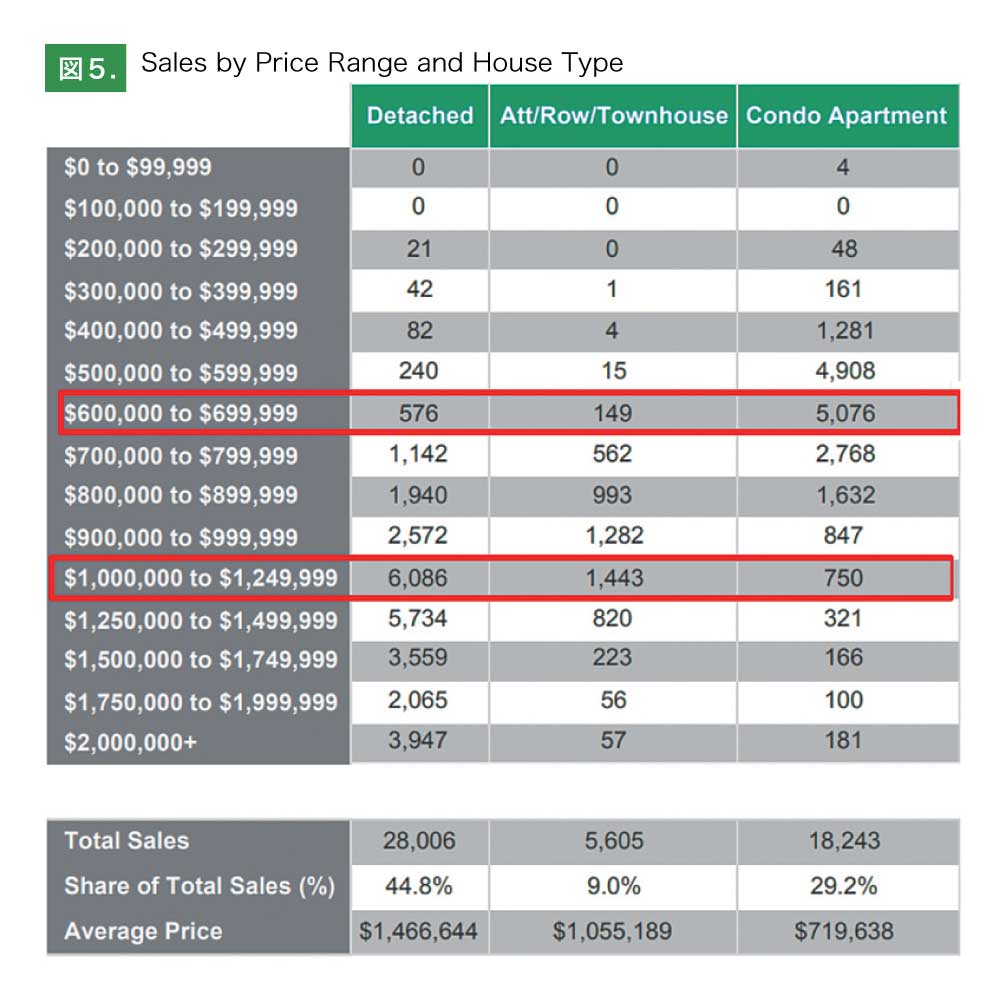 売買マーケットにおいて2023年に最も売買件数が多かった物件種別は戸建て(Detached)で、全体取引件数の44.8%を占めています。最も売れた価格帯は100万ドル~125万ドルの物件で戸建て売買件数の21%を占めています。また2番目に売買件数が多かったのはコンドミニアムで全体取引件数の29.2%、最も売れた価格帯は60万ドルから70万ドルの物件でコンドミニアム売買件数の24%を占めています(図5参照)。