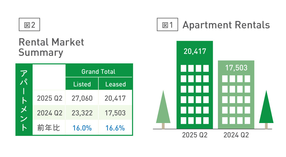 トロント不動産協会(Toronto Real Estate Board=TREB)発表による2025年第2四半期のRental Market Reportによりますと、今年4月~6月における賃貸物件募集件数は2万7060件、前年同期比16%アップとなりました。成約件数は2万417件と、前年に比べて16.6%アップとなりました。2025年第1四半期と比べてさらに募集件数が増加する一方、成約件数は第1四半期と横ばいな増加率となりました(図1、2)。