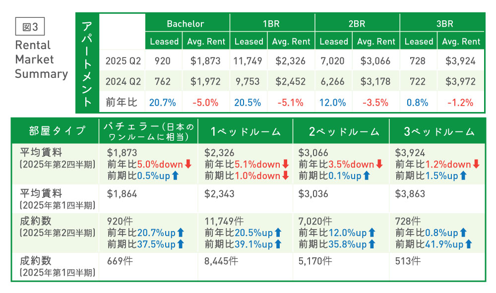 平均賃料を見ますと、バチェラー(ワンルームタイプ)は1873ドル、1BRが2326ドル、2BRは3066ドル、3BRが3924ドルと、全ての間取りにおいて前年同期比で約1.2~5.1%程度のダウンとなりました。3BRにおいては前期に引き続き400ドルを下回る賃料になりました。2025年第1四半期に比べると、1BR以外の間取りにおいて0.1~1.5%程度平均賃料が上がりましたが、不動産シーズンであるはずの第2四半期において、1BRの平均賃料が第1四半期より下がっていることは、引き続き同タイプの間取りにおいて供給過多状態が続いていることを示しています。成約件数においては、全ての間取りにおいて前年同期比約0.8%~20.7%アップと賃貸ニーズは変わらず継続しています。第1四半期と比べますと、第2四半期は不動産も人の動きも活発になるシーズンのため、成約件数は全ての間取りにおいて前期比約35.8~41.91%程度のアップとなりました(図3)。