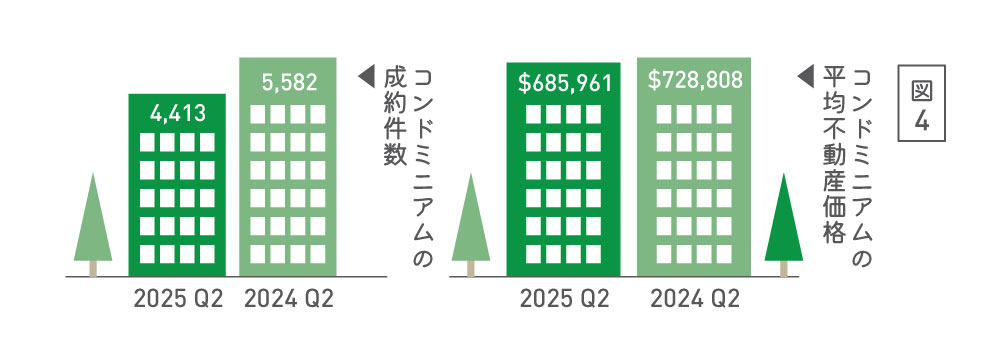 賃貸マーケットの平均賃料の下落、成約件数の急増の背景として引き続き売買マーケットの不振があります。トロント不動産協会による2025年第2四半期のコンドミニアムマーケットレポートによれば、平均不動産価格は68万5961ドルと前年同期比2.2%ダウンでした。また、この期間に売出しされた件数は9530件で前年同期比39.3%アップに対して、実際に売れた成約件数は4413件で前年同期比20.9%ダウンと、コンドミニアムの売買マーケットにおいて前年に引き続きさらに供給が増えている一方で、成約数が減っていることを示しています(図4)。