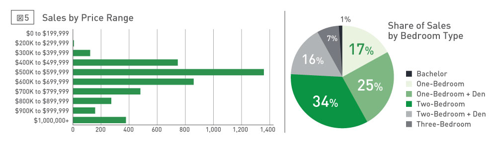 今年第2四半期において最も売れた物件の価格帯は、第1四半期同様、50万ドル~60万ドル、および60万ドル~70万ドル、次いで40万ドル~50万ドルでした。40万ドル台が引き続き第3位になっていることはコンドミニアムの平均価格の低下を顕著に示しています。また最も売れた間取りは2BRの34%、および1BR+DENの25%、次いで1BRの17%となっています。2BRと1BR+DENの割合が前年同期比で各1%アップずつ伸びており、このことから不動産平均価格の低下によって、買えるならばより広い1BR+DENや2BRのタイプを購入している人が増えていることが窺えます(図5)。
