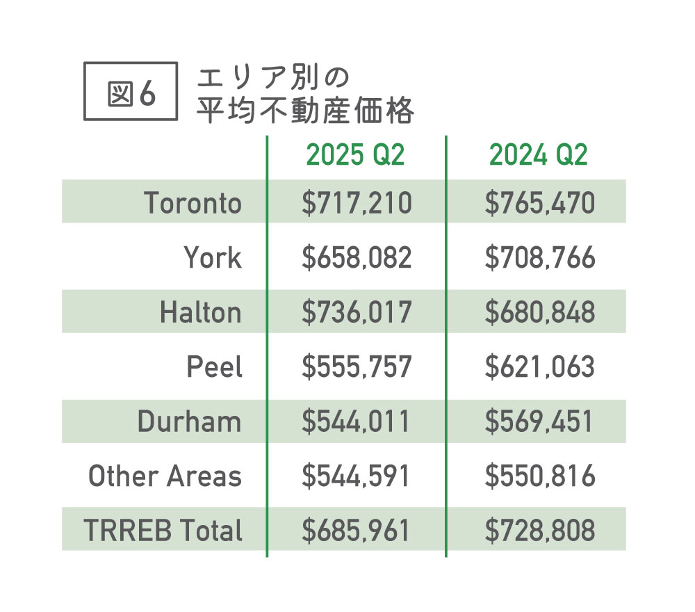 エリア別の平均不動産価格を見てみますと、高額順にハルトン地区73万6017ドル(前年同期比8%アップ)、トロント地区71万7210ドル(前年同期比7.4%ダウン)、ヨーク地区65万8082ドル(前年同期比8.2%ダウン)、ピール地区55万5757ドル(前年同期比10.6%ダウン)、ダラム地区54万4011ドル(前年同期比4.5%アップ)となり、ハルトン地区を除いてエリアでは平均不動産価格が下がっています(図6)。