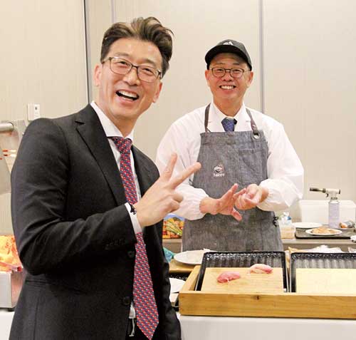 そのリクエストに応え、太郎さんが用意したのは、日本のウニやカナダ産の本マグロ、そして厳選されたポルトガルやニュージーランドの天然鮮魚を中心とした豪華な刺身プレート、そしてTaro’s Fishのマーカム店で人気を博している「ハンドロール」。さらには、太郎さん自らがカウンターに立ち、来場者の目の前で一貫ずつ丁寧に握る寿司のライブサービスも用意された。