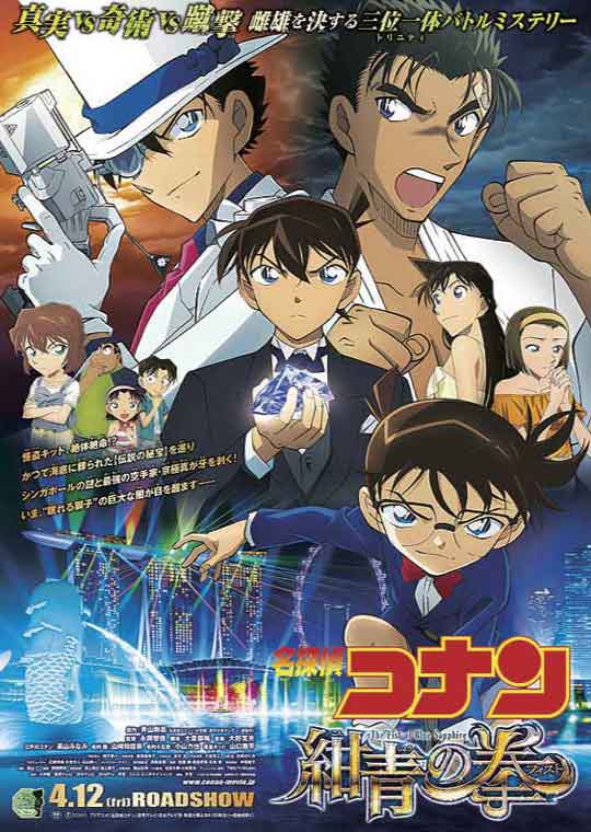 大ヒットアニメシリーズ「名探偵コナン」の劇場版23作目。シンガポールを舞台に、伝説の宝石をめぐる謎と事件が巻き起こる。19世紀末に海賊船とともにシンガポールの海底に沈んだとされるブルーサファイア「紺青の拳」を、現地の富豪が回収しようとした矢先、殺人事件が発生。現場には、怪盗キッドの血塗られた予告状が残されていた。