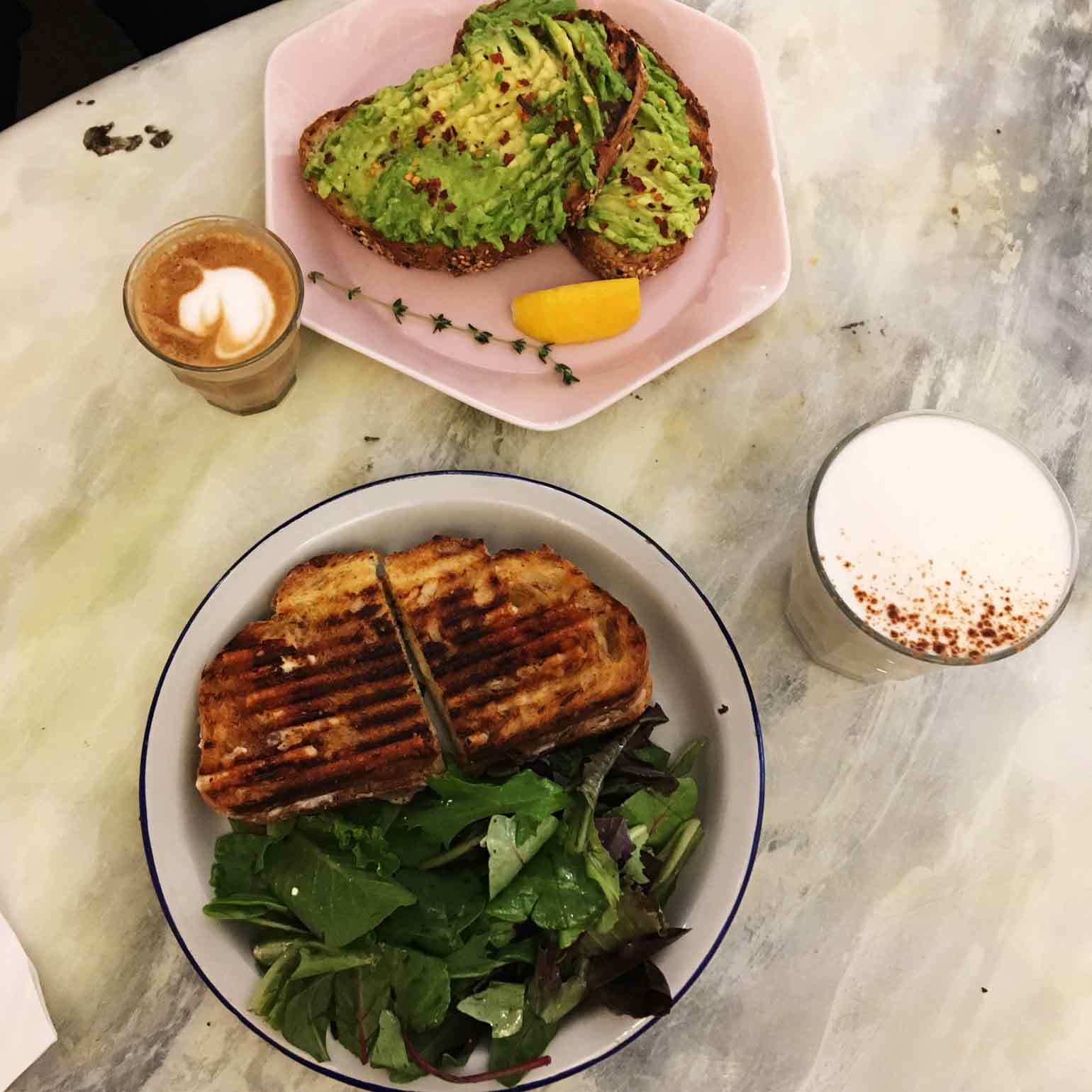 手前はグリルドチーズとチャイラテ、奥はアボカドトーストとカプチーノ(予想外のショットグラスサイズ)。