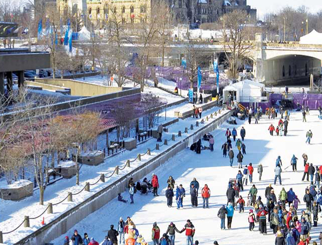 - 川全体が凍って大きなスケート場へ早変わり。オタワのリドー運河で冬にスケートをする