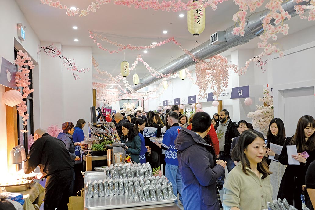 フードはトレーサービス形式で提供され、おにぎりやフィンガーフードが会場内を巡る。さらに各ブースでは桜大福をはじめとしたサンプルが提供され、来場者は自由に味わいながら回遊することができた。