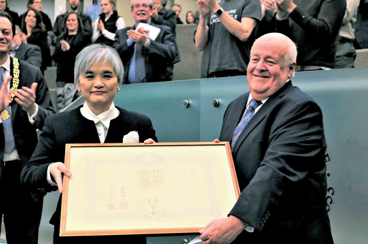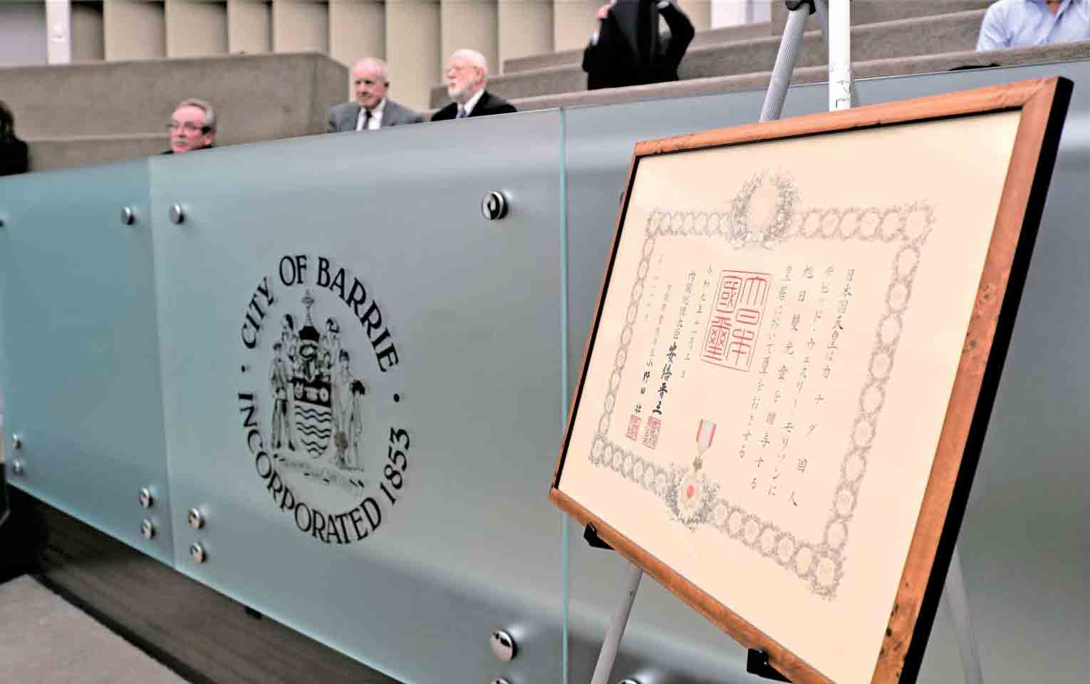 1月13日、伊藤恭子・在トロント日本国総領事により、姉妹都市交流に尽力したデビッド・ウェスリー・モリソン氏への外国人叙勲伝達式がオンタリオ州・バリー市の市議会議場で行われた。
